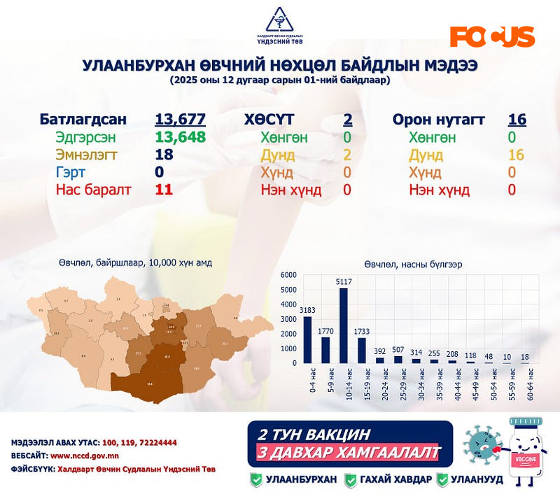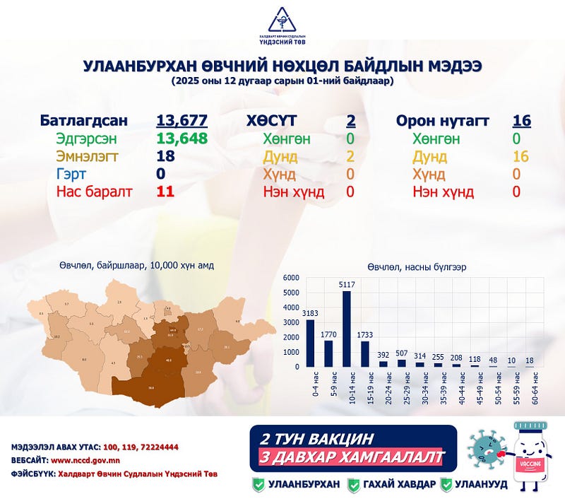 Халдварт өвчин судлалын үндэсний төвөөс гаргасан мэдээллээр, 2025 оны арванхоёрдугаар сарын 1-ний байдлаар улаанбурхан өвчний нийт батлагдсан тохиолдол 13.677 болжээ. Нийт нөхцөл байдлын хувьд эдгэрсэн 13,648, нас барсан 11 болжээ. Эмнэлэгт 18 хүн хэвтэн эмчлүүлж байгаа.