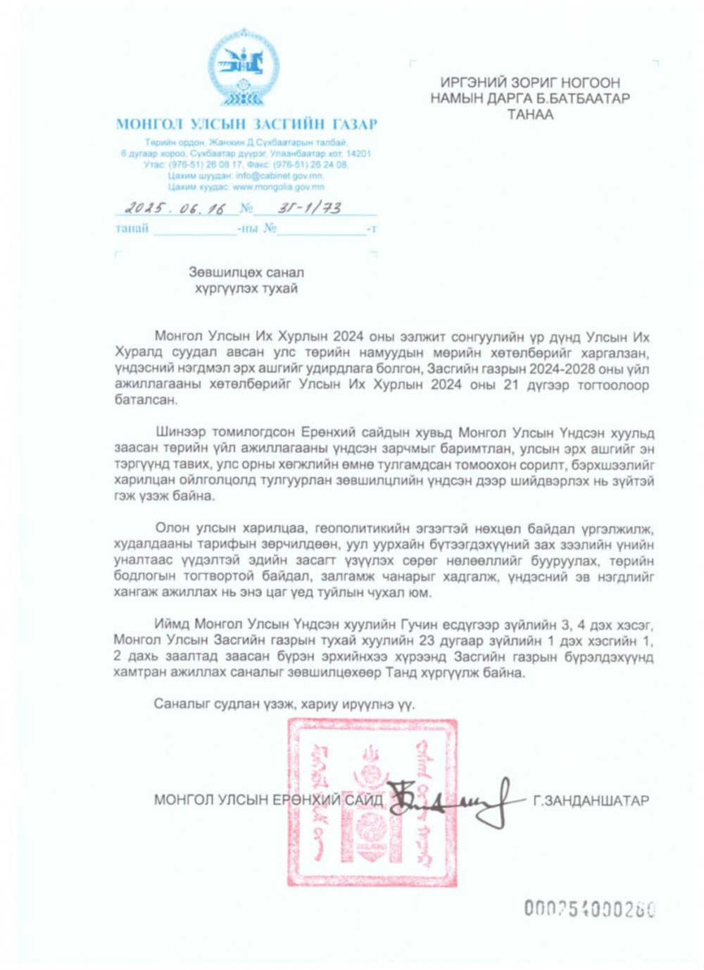 Уг бичигт “Шинээр томилогдсон Ерөнхий сайдын хувьд Монгол Улсын Үндсэн хуульд заасан төрийн үйл ажиллагааны үндсэн зарчмыг баримтлан, улсын эрх ашгийг эн тэргүүнд тавих, улс орны хөгжлийн өмнө тулгамдсан томоохон сорилт, бэрхшээлийг харилцан ойлголцолд тулгуурлан зөвшилцлийн үндсэн дээр шийдвэрлэх нь зүйтэй хэмээн үзэж байна гээд Олон улсын харилцаа, геополитикийн эгзэгтэй нөхцөл байдал үргэлжилж худалдааны тарифын зөрчилдөөн, уул уурхайн бүтээгдэхүүний зах зээлийн уналтаас үүдэлтэй эдийн засагт үзүүлэх сөрөг нөлөөллийг бууруулах, төрийн бодлогын тогтвортой байдал, залгамж чанарыг хадгалж, үндэсний эв нэгдэл хангаж ажиллах нь энэ цаг үед туйлын чухал юм” гэж онцолжээ.