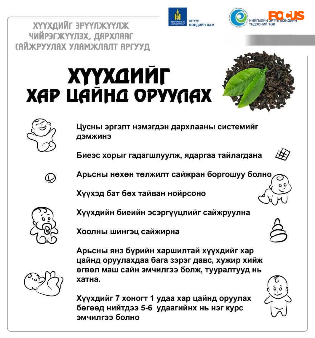Ингэхдээ хүүхдийг хар цайнд оруулах давуу талуудыг дурдсан бөгөөд харшилтай хүүхдийг давс, хужиртай хар цайнд оруулах нь сайн эмчилгээ болно хэмээн онцолжээ. Мөн 7 хоногт 1 удаа хар цайнд оруулах бөгөөд нийтдээ 5-6 удаагийнх нь нэг курс эмчилгээ болдог аж.