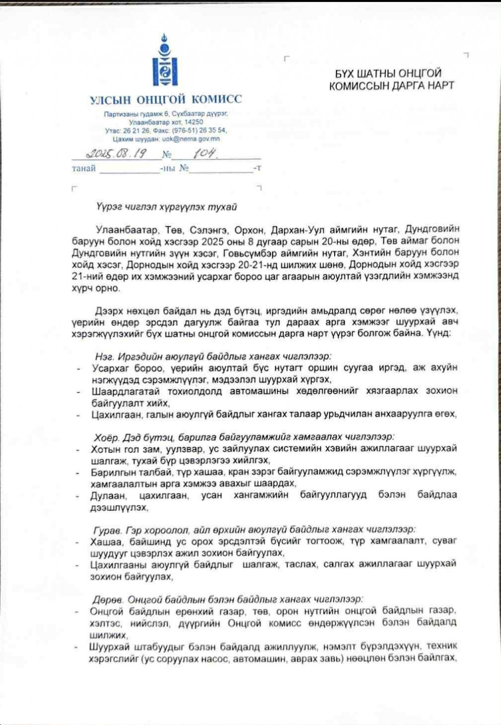 2025 оны 8-р сарын 20-21-ний өдрүүдэд Улаанбаатар хот болон Төв, Сэлэнгэ, Орхон, Дархан-Уул, Дундговь, Говьсүмбэр, Хэнтий, Дорнод аймгийн нутгаар усархаг бороо орох төлөвтэй байгаа талаар Ус, цаг уур, орчны шинжилгээний газраас мэдээлсэн. Үүнтэй холбогдуулан үерийн аюул нэмэгдэх эрсдэлтэй байгааг анхаарч, Монгол Улсын Шадар сайд, Улсын онцгой комиссын дарга С.Амарсайхан бүх шатны Онцгой комисст шуурхай арга хэмжээ авч, өндөржүүлсэн бэлэн байдлаар ажиллах үүрэг чиглэл өглөө.
