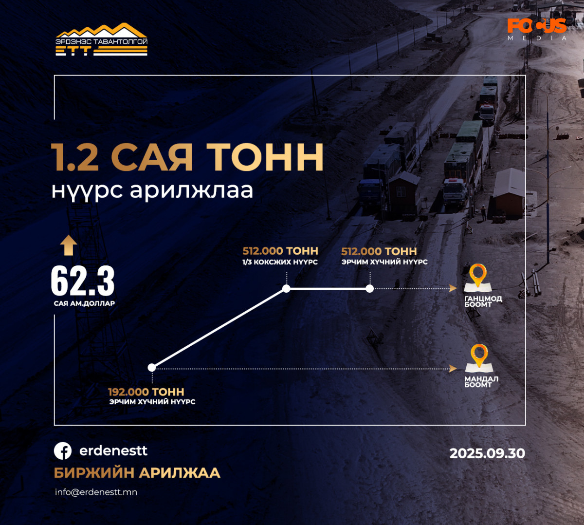 “Эрдэнэс Тавантолгой” ХК энэ оны наймдугаар сарын 13-ны өдөр гурван удаагийн арилжаагаар нийт 595.2 мянган тонн нүүрсийг 43.8 сая ам.доллараар арилжаалсан нь хамгийн өндөр үзүүлэлт болж байсан бол түүнээс хойш хамгийн өндөр дүнтэй арилжааг өнөөдөр /2025.09.30/ хийлээ.