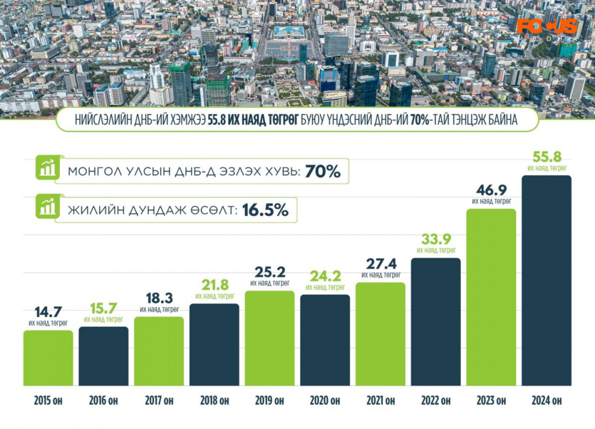 Монгол Улсын хэмжээнд үйл ажиллагаа явуулж буй ААН-ийн 76 хувь нь Улаанбаатар хотод бүртгэлтэй байдаг. Түүнчлэн худалдаа, үйлчилгээний салбарын 84, хуримтлалын 81 хувь нь Улаанбаатар хотод төвлөрдөг төдийгүй улсын дотоодын нийт бүтээгдэхүүний 70 хувийг нийслэл хот дангаараа үйлдвэрлэж байна. Өөрөөр хэлбэл, нийслэлийн ДНБ-ий хэмжээ 55.8 их наяд төгрөгт хүрч, Монгол Улсын ДНБ-ий 70 хувийг бүрдүүлж байгаа юм. Нийслэлийн ДНБ арван жилийн өмнө буюу 2015 онд 14.7 их наяд төгрөг байсан бол өнөөдөр ийнхүү 50 их наяд төгрөг давлаа.