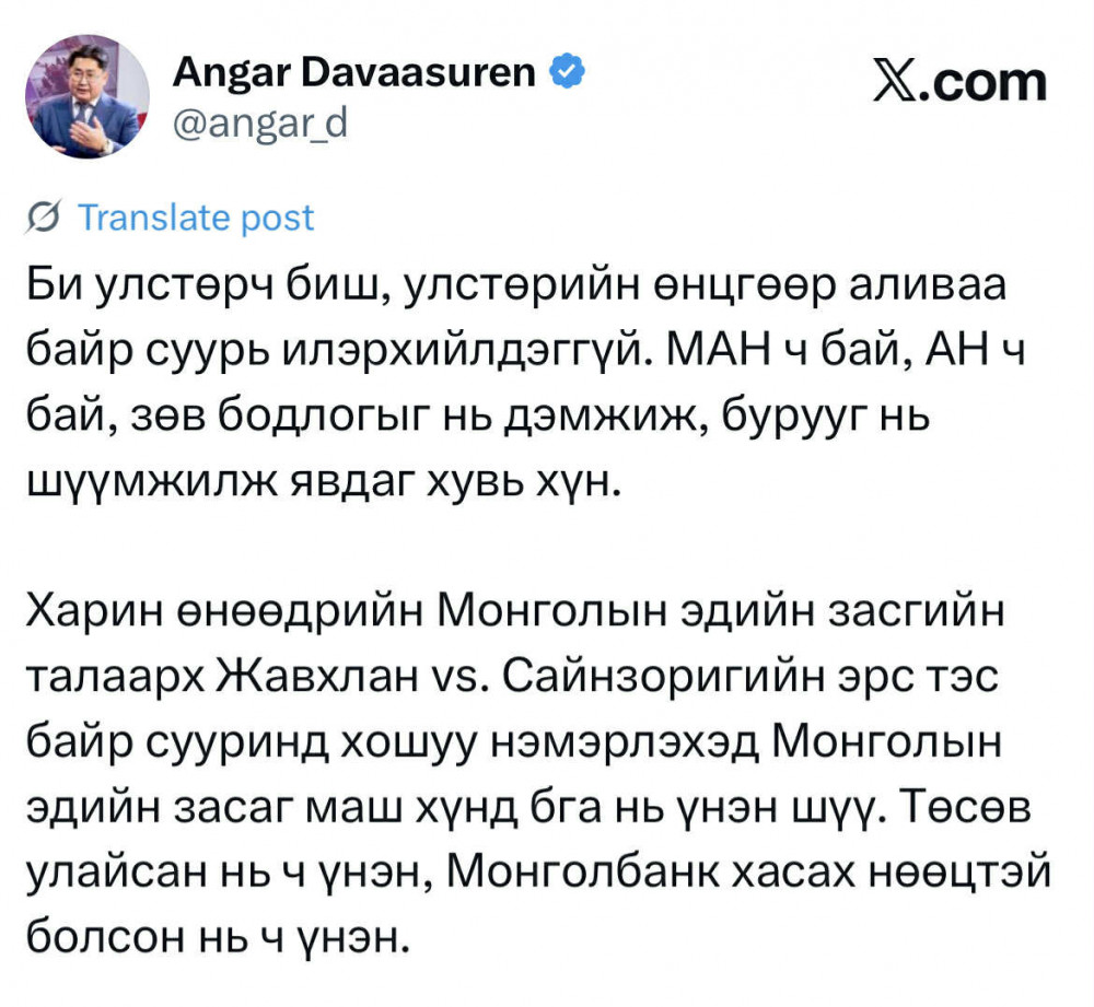 Жич: Өнөөдөр нэг яриа сонслоо. Нэг хэсэг маш хурдан тархсан апп-н шуурхайн зээлийн компаниудын ихэнхи нь шинэ зээл гаргахаа зогсоосон гэнэ. Иргэд мөнгөгүй болж апп-н зээлийн чанаргүй зээл маш хурдацтай өсөж бга гэнэ. Энэ л эдийн засгийн, иргэдийн амьжиргааны бодит үзүүлэлт. Нийт GDP, нийт экспорт, нийт төлбөрийн баланс...нтр бол иргэдийн бодит байдлыг илэрхийлж чаддаггүй! гэжээ.