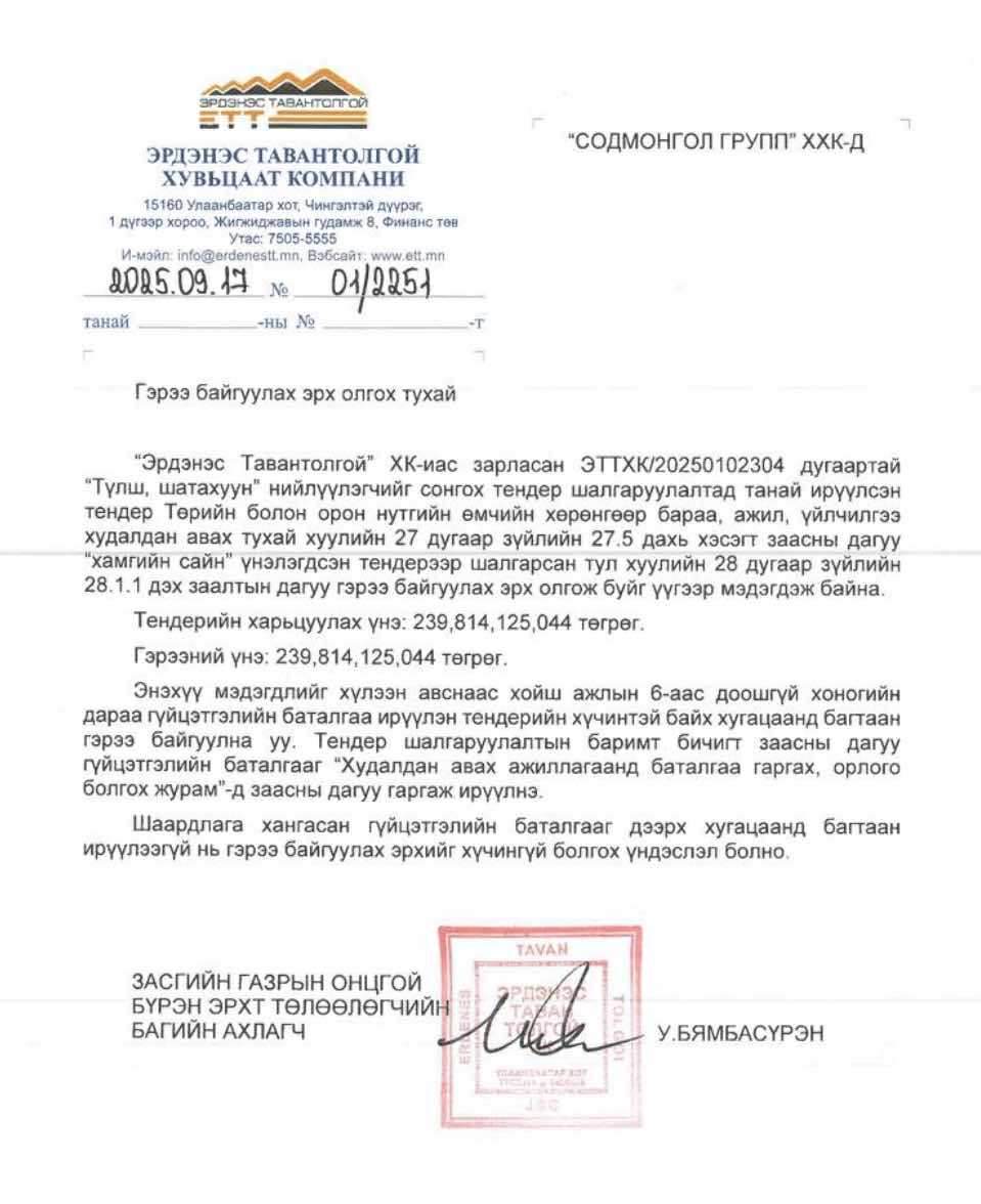 “Эрдэнэс Тавантолгой” ХК 2025 оны есдүгээр сард 322 тэрбум төгрөгийн өртөг бүхий шатахууны худалдан авах тендер зарлаж, уг шалгаруулалтад “Сод Монгол” ХХК ялалт байгуулжээ.