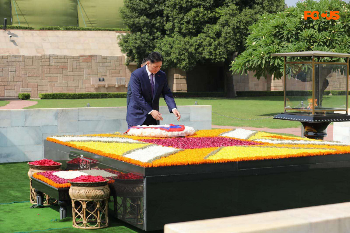 Ерөнхийлөгч У.Хүрэлсүх дэлхийн энх тайван, шударга ёсны бэлгэ тэмдэг болсон аугаа суут хүмүүн Махатма Ганди-гийн дурсгалын цогцолборт хүндэтгэл үзүүлж, цэцэг өргөлөө.