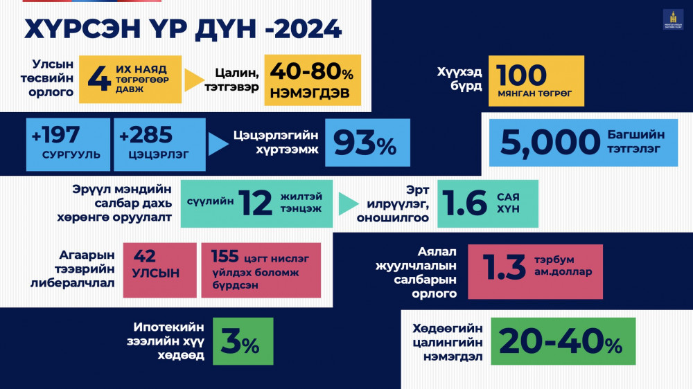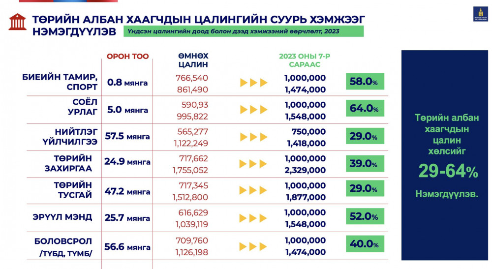 "2021-2024 онд Л.Оюун-Эрдэнийн ЗГ багш, эмч нарын цалинг огт нэмээгүй гэх ташаа мэдээлэл тарааж байгаа бололтой. Гэвч цар тахлын дараах сэргэлт буюу 2023 оны төсвийн тодотголоор 200 гаруй мянган төрийн албан хаагчийн суурь буюу ямар ч нэмэгдэл ороогүй цалинг 30-60% нэмэгдүүлсэн. Үүнээс хойш инфляцийн нэмэгдэл болон орон нутгийн 20-40% нэмэгдсэн. 2024 оны төгсгөлд цалин 40-80% нэмэгдэж байв. Салбарын сайдаар ажиллаж байсан Энх-Амгалан Лувсанцэрэн хамгийн өндөр төсөвтэй сайд байсан. Өөрөө ч батлах биз ээ...