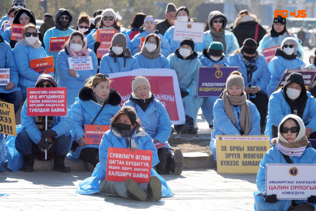Харин эмч нарын цалинг яаж шийдэх вэ? Сүхбаатарын талбай дээр нийслэл дүүрэг орон нутгийн эмнэлгийн 3000 гаруй эмч, эмнэлгийн ажилтнууд жагсаж Төрийн ордон тойрон гороолсон.