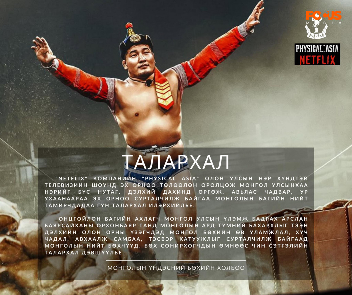 "Netflix" компанийн "Physical Asia" олон улсын нэр хүндтэй телевизийн шоунд эх орноо төлөөлөн оролцож Монгол Улсынхаа нэрийг дэлхий дахинд өргөж, авьяас чадвар, ур ухаанаараа эх орноо бахархалтайгаар төлөөлсөн Монголын багийн нийт тамирчдадаа гүн талархал илэрхийлье.