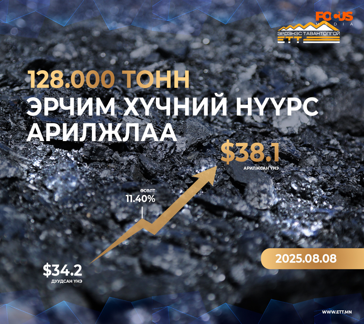 "Эрдэнэс Тавантолгой" ХК 2025 оны 8 дугаар сарын 8-ны өдөр Монголын Хөрөнгийн Биржээр дамжуулан 20 багц буюу 128 мянган тонн эрчим хүчний нүүрс БНХАУ-ын Ганцмод боомт хүргэж өгөх нөхцөлөөр амжилттай арилжааллаа. Арилжаанд 2 оролцогч оролцож үнэ 11.40% өсөж 38.10 ам.доллароор хэлцэл хийгдлээ.