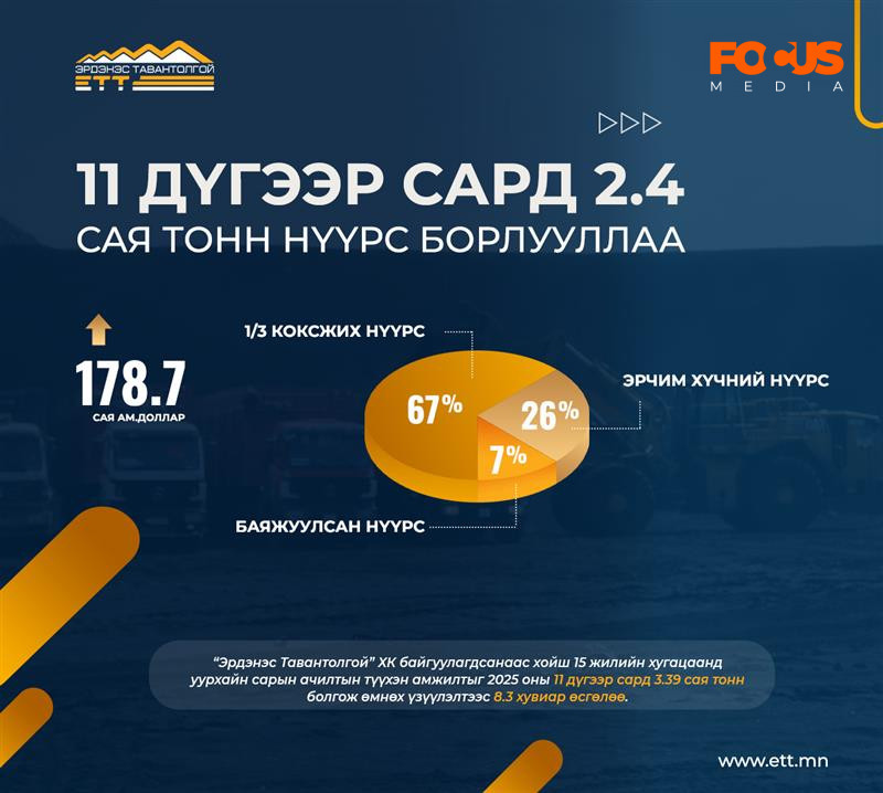 Мөн “Эрдэнэс Тавантолгой” ХК байгуулагдсанаас хойш 15 жилийн хугацаанд уурхайн сарын ачилтын түүхэн амжилтыг 2025 оны 11 дүгээр сард 3.39 сая тонн болгож өмнөх үзүүлэлтээс 8.3 хувиар өсгөлөө. Уурхай ачилтыг нэмэгдүүлсэнтэй холбоотойгоор тухайн сард нэмүү өртөг шингэсэн хил нөхцөлөөр биржээр арилжаалсан 1.29 сая тонн нүүрс экспортолсон нь биржийн арилжаа эхэлсэн 2023 оноос хойш хамгийн өндөр үзүүлэлт болоод байна.