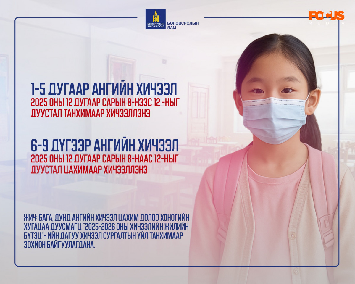 • 6–9 дүгээр ангийн хичээл 2025 оны 12 дугаар сарын 8-наас 12-ныг дуустал цахимаар хичээллэнэ.