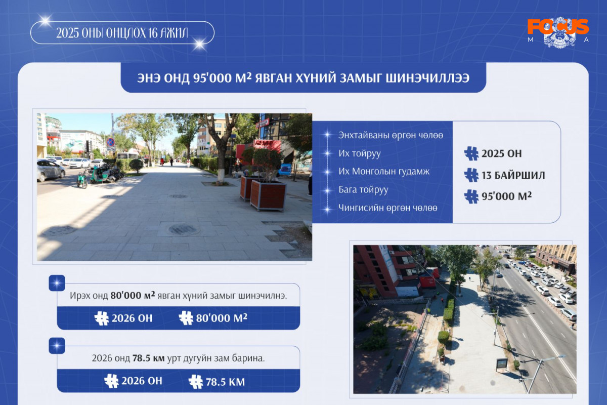 Энэ онд Улаанбаатар хотын гол гудамж, замууд болох Энхтайваны өргөн чөлөө, Их тойруу, Бага тойруу, Их Монголын гудамж болон Чингисийн өргөн чөлөө дагуух 13 байршилд 95 мянган ам.метр явган хүний замыг шинэчиллээ. Явган хүний замыг барзгар гадаргуутай байгалийн чулуун хавтангаар шинэчилж буй онцлогтой. 2026 онд үргэлжлүүлэн 80 мянган ам.метр явган хүний замыг шинэчилнэ. Барилгын ажлыг ирэх оны хавар эхлүүлнэ. Харин явган хүний замын хуучин хавтанг гэр хорооллын гудамж, талбайг тохижуулахад ашиглаж байна. Жишээлбэл, Сонгинохайрхан дүүргийн 8, 15, 18, 20, 25, 27, 43 дугаар хорооны нарийн гудамжны 1500 ам.метр талбайг хуучин хавтангаар тохижууллаа. Явган хүний замаас гадна ирэх онд 78.5 км урт дугуйн зам барихаар нарийвчилсан зураг төслийг боловсруулж байна. 2026-2028 онд нийслэлийн төвийн зургаан дүүрэгт нийт 253 км урт дугуйн зам барихаар төлөвлөлөө.