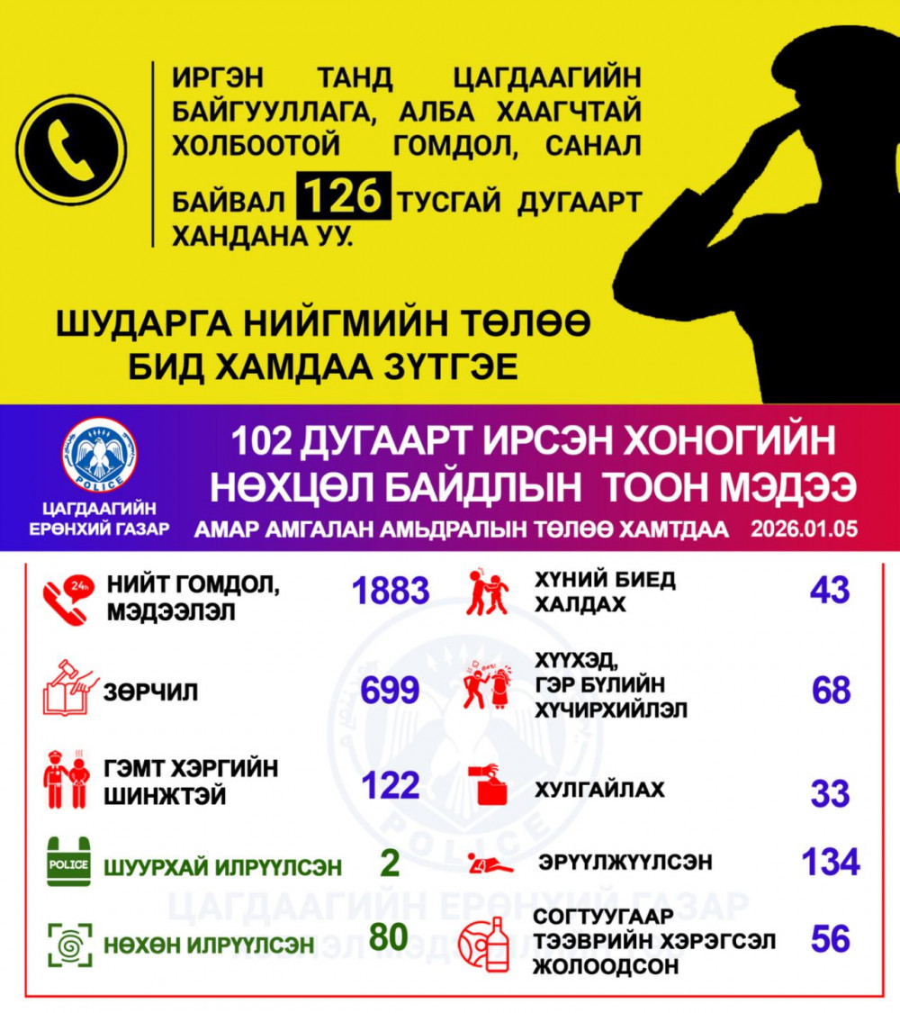 Цагдаагийн байгууллагын 102 тусгай дугаарт 2026 оны 01 дүгээр сарын 05-ны өдөр нийт 1883 дуудлага, мэдээлэл бүртгэгдсэнээс зөрчлийн шинжтэй 699, гэмт хэргийн шинжтэй 122 дуудлага, мэдээлэл байна.