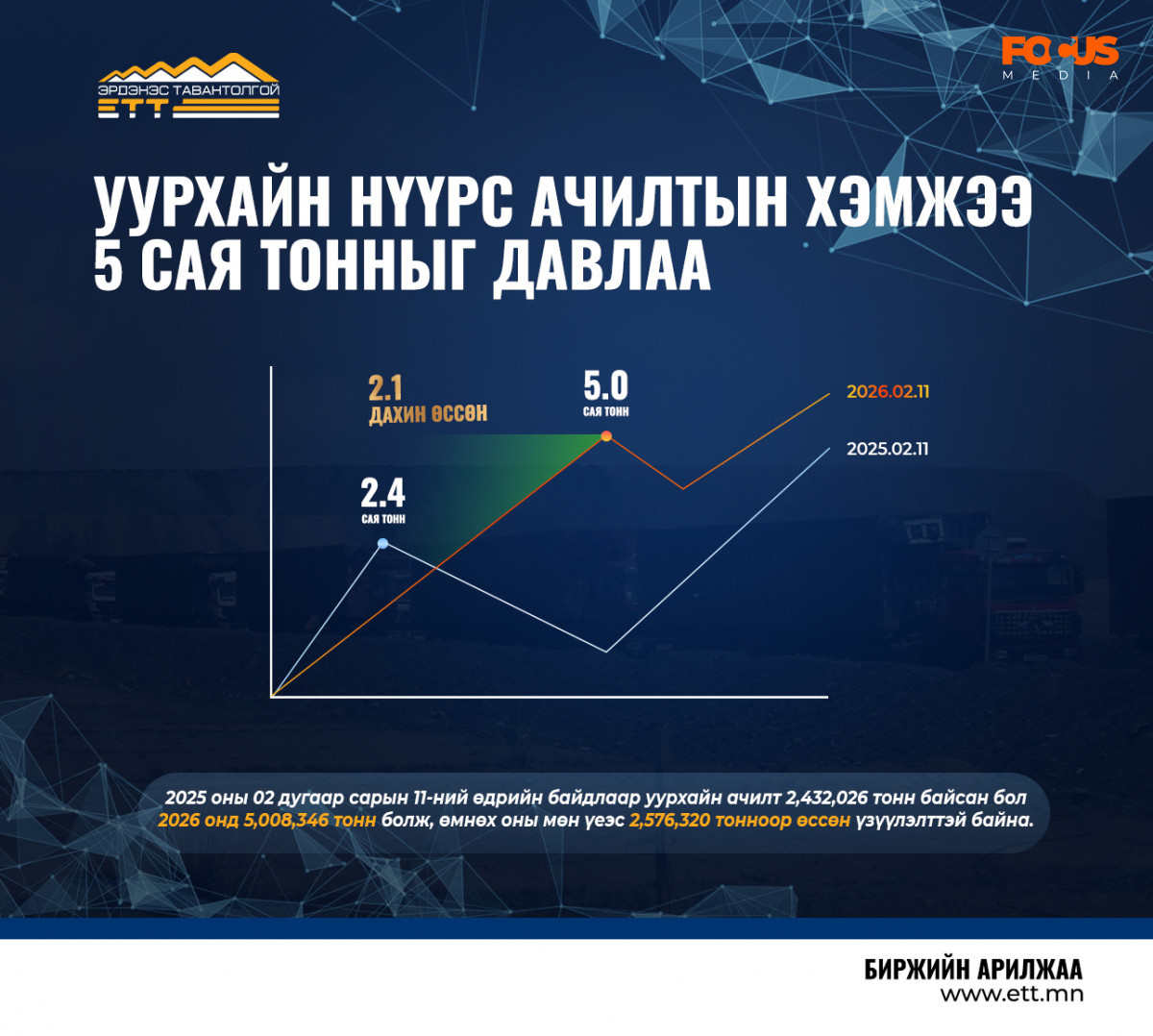 Тодруулбал 2025 оны 02 дугаар сарын 11-ний өдрийн байдлаар уурхайн ачилт 2,432,026 тонн байсан бол 2026 онд 5,008,346 тонн болж, өмнөх оны мөн үеэс 2,576,320 тонноор өссөн үзүүлэлттэй байна.