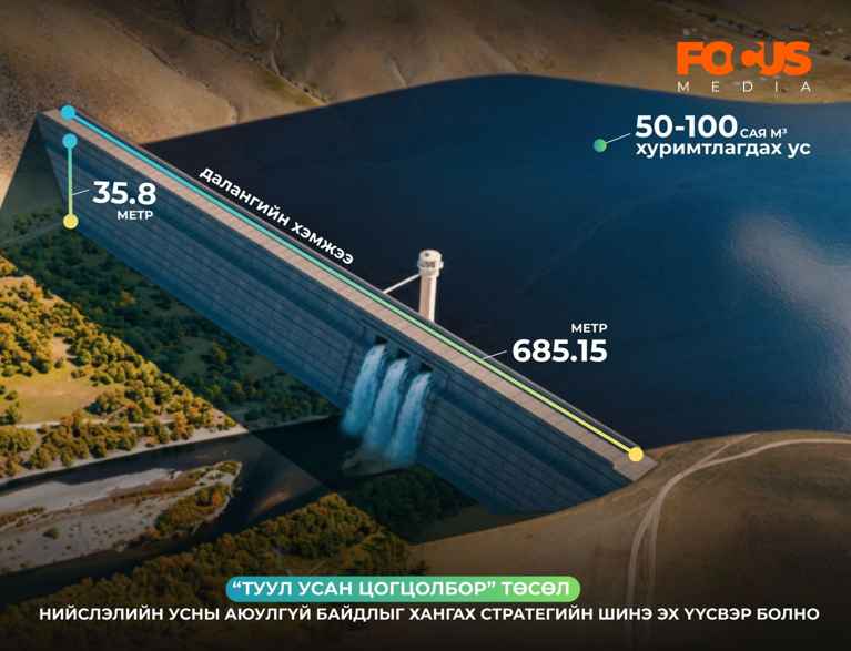 “Туул усан цогцолбор” нь гадаргын усыг хуримтлуулах шинэ эх үүсвэр бий болгох бөгөөд урьдчилсан судалгаагаар тус байгууламж 5,569 га ус хурах талбайтай, 50-100 сая шоо метр ус хуримтлуулах хүчин чадалтай байхаар тооцоологдсон. Далангийн урт 685.15 метр, өндөр 35.8 метр, хурдсын гүн 19.84 метр байх инженерийн үндсэн шийдэл нь нийслэлийн өсөн нэмэгдэх хэрэгцээг урт хугацаанд хангах боломж бүрдүүлнэ гэж үзэж байна.