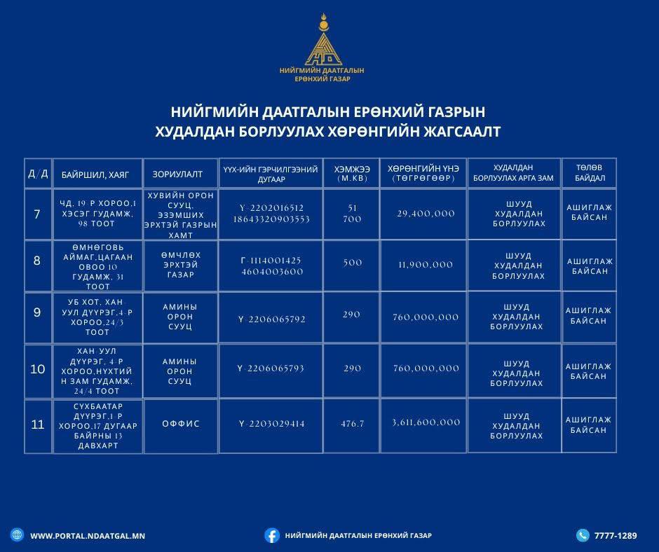 Тэгвэл худалдан борлуулагдаагүй үлдсэн 37 ширхэг хөрөнгөнөөс шууд худалдан борлуулах боломжтой 11 үл хөдлөх хөрөнгийн мэдээллийг та бүхэнд хүргэж байна.