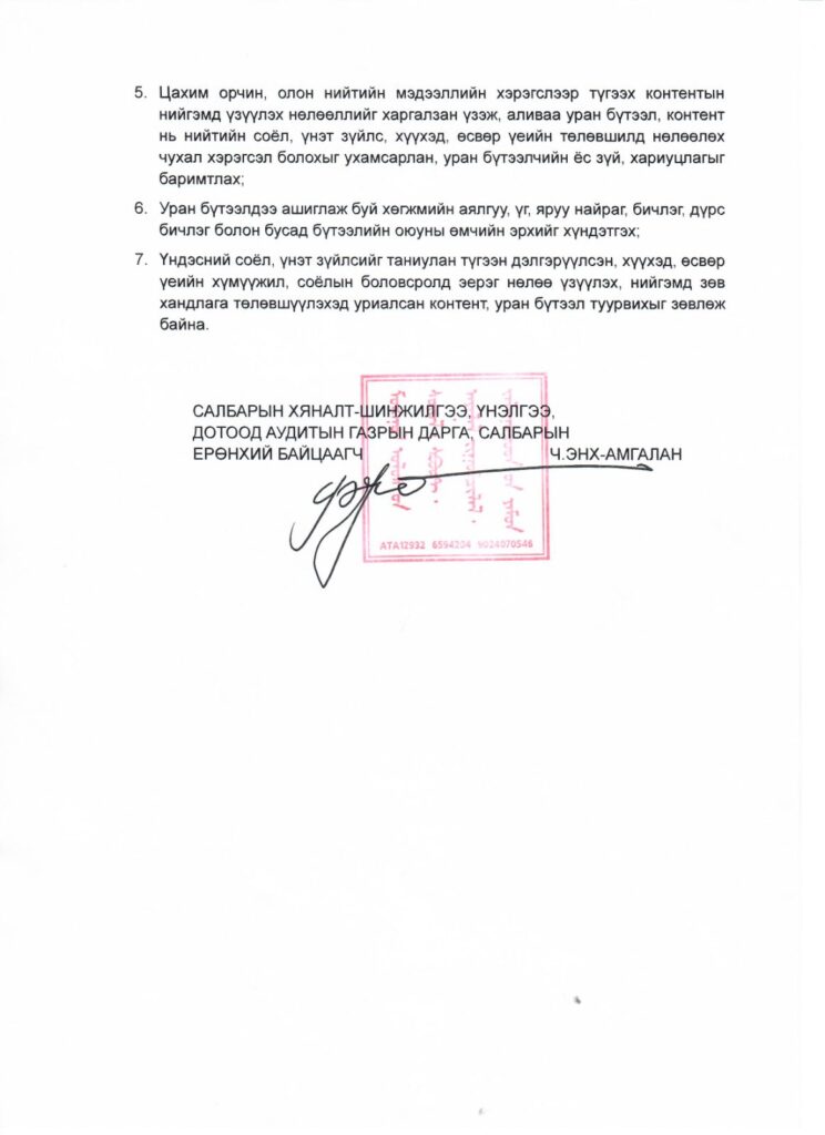 5. Цахим орчин, олон нийтийн мэдээллийн хэрэгслээр түгээх контентын нийгэмд үзүүлэх нөлөөллийг харгалзан үзэж, аливаа уран бүтээл, контент нь нийтийн соёл, үнэт зүйлс, хүүхэд, өсвөр үеийн төлөвшилд нөлөөлөх чухал хэрэгсэл болохыг ухамсарлан, уран бүтээлчийн ёс зүй, хариуцлагыг баримтлах;