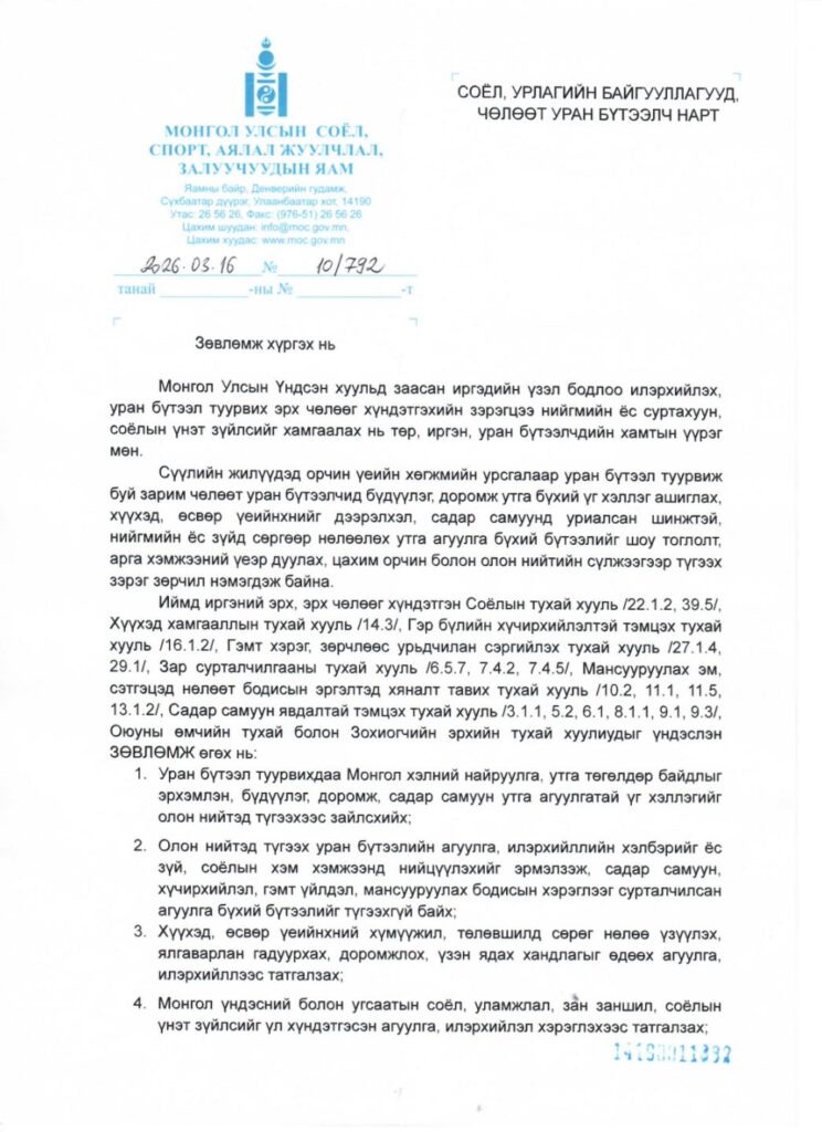 Энэ асуудалтай холбогдуулан Соёл, спорт, аялал жуулчлалын яамнаас иргэний эрх, эрх чөлөөг хүндэтгэн холбогдох хуулиудыг үндэслэн зөвлөмж гаргажээ.