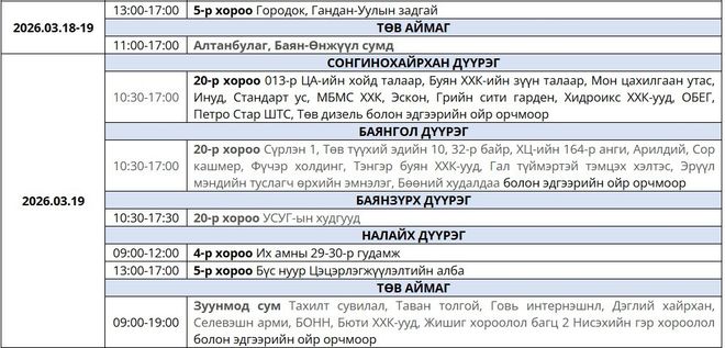 Цахилгааны хязгаарлалт хийж, цахилгаан шугам тоноглолд засвар үйлчилгээ хийх байршлуудын мэдээллийг хүргэж байна.