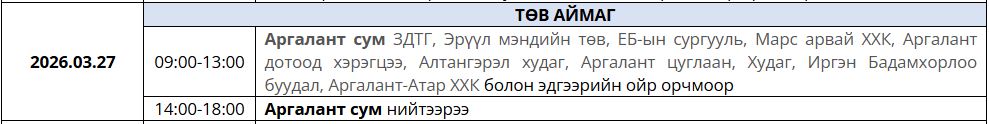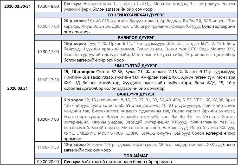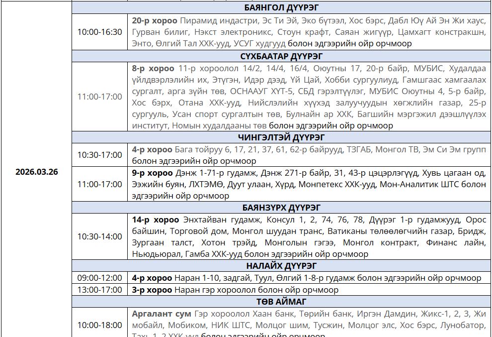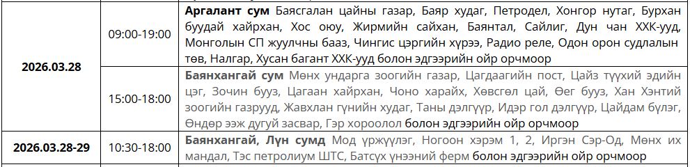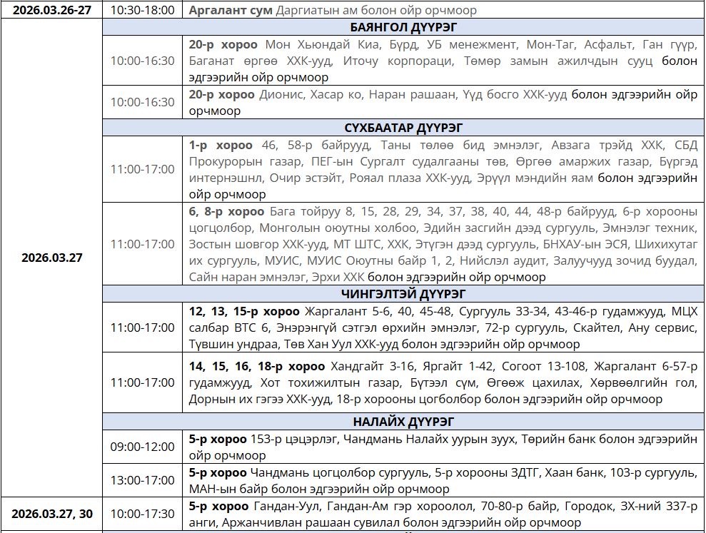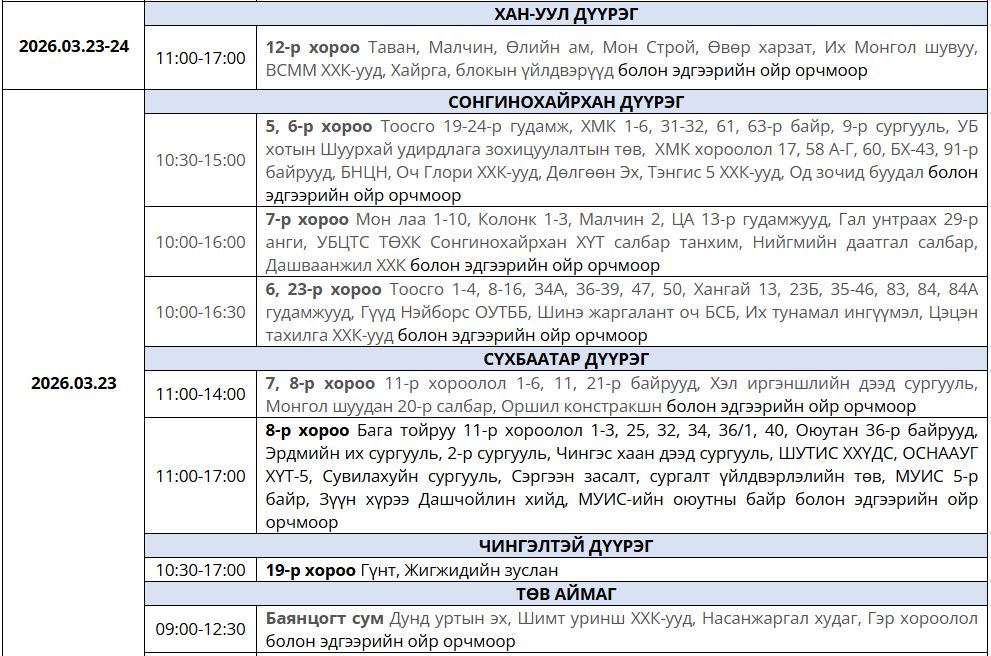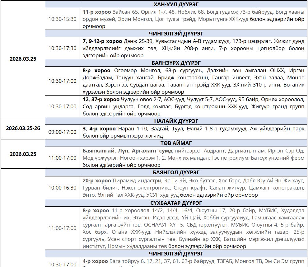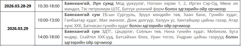 Ирэх 7 хоногт /2026.03.23-03.29/ цахилгаан шугам тоноглолд засвар үйлчилгаа хийх хуваарийг танилцуулж байна.