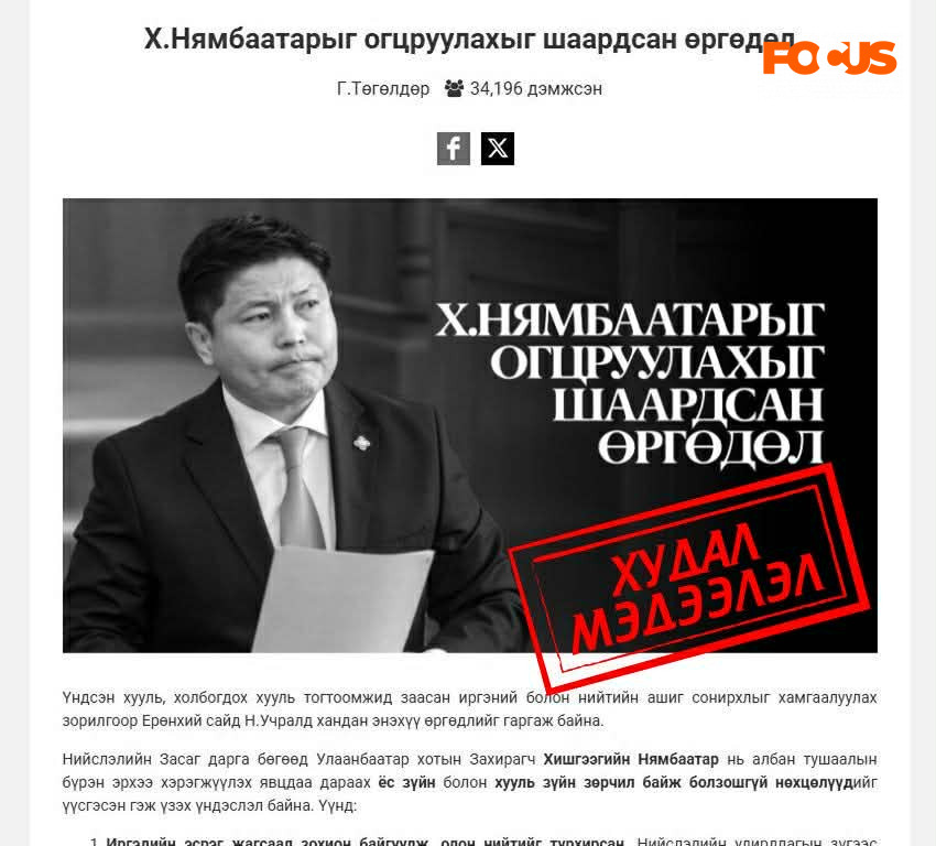 НЗДТГ-аас “United info hub” сайтад тавигдсан хотын дарга Х.Нямбаатарыг огцруулахтай холбоотой өргөдөл нь зохион байгуулалттай. Хууль журамд нийцээгүй, олон нийтийг төөрөгдүүлсэн мэдээлэл. Монгол Улсын холбогдох хууль тогтоомжоор УИХ-аар аливаа өргөдөл, саналыг хэлэлцүүлэхэд зөвхөн төрийн албан ёсны сайтад байршуулах ёстой.