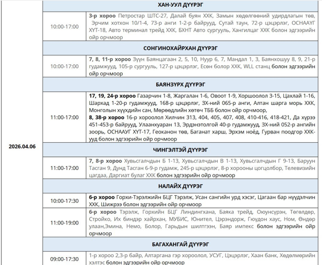 Цахилгаан эрчим хүчний найдвартай, тасралтгүй ажиллагааг хангах зорилгоор төлөвлөгөөт засвар үйлчилгээ хийхтэй холбогдуулан дараах байршилд түр хугацаанд цахилгааны хязгаарлалт хийж буй. Өнөөдөр 10:00-17:00 цагийн хооронд эрчим хүч хязгаарлана.