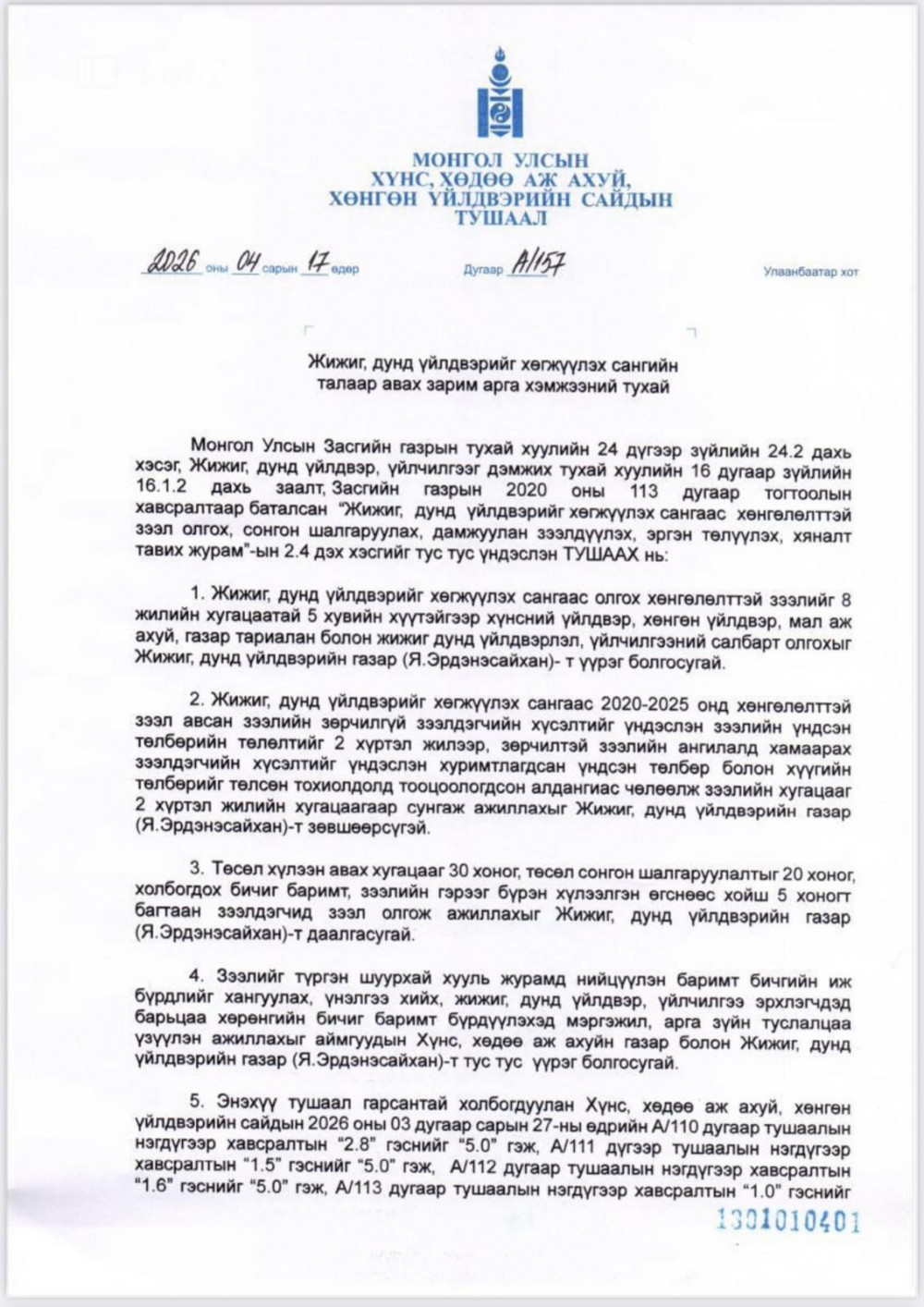 Жижиг, дунд үйлдвэрийг хөгжүүлэх сангийн талаар авах зарим арга хэмжээний тухай Хүнс, хөдөө аж ахуй, хөнгөн үйлдвэрийн сайдын А/157 дугаар тушаал гарлаа. Уг тушаалаар Жижиг, дунд үйлдвэрийг хөгжүүлэх сангаас олгох хөнгөлөлттэй зээлийг 8 жилийн хугацаатай, 5 хувийн хүүтэйгээр хүнсний үйлдвэр, хөнгөн үйлдвэр, мал аж ахуй, газар тариалан болон жижиг дунд үйлдвэрлэл, үйлчилгээний салбарт олгохыг үүрэг болгосон байна. Ингэснээр Жижиг, дунд үйлдвэрийн газраас үндсэн хөрөнгийн зээлийг 8 жил, эргэлтийн хөрөнгийн зээлийг 5 жилийн хугацаатай олгож эхэллээ.